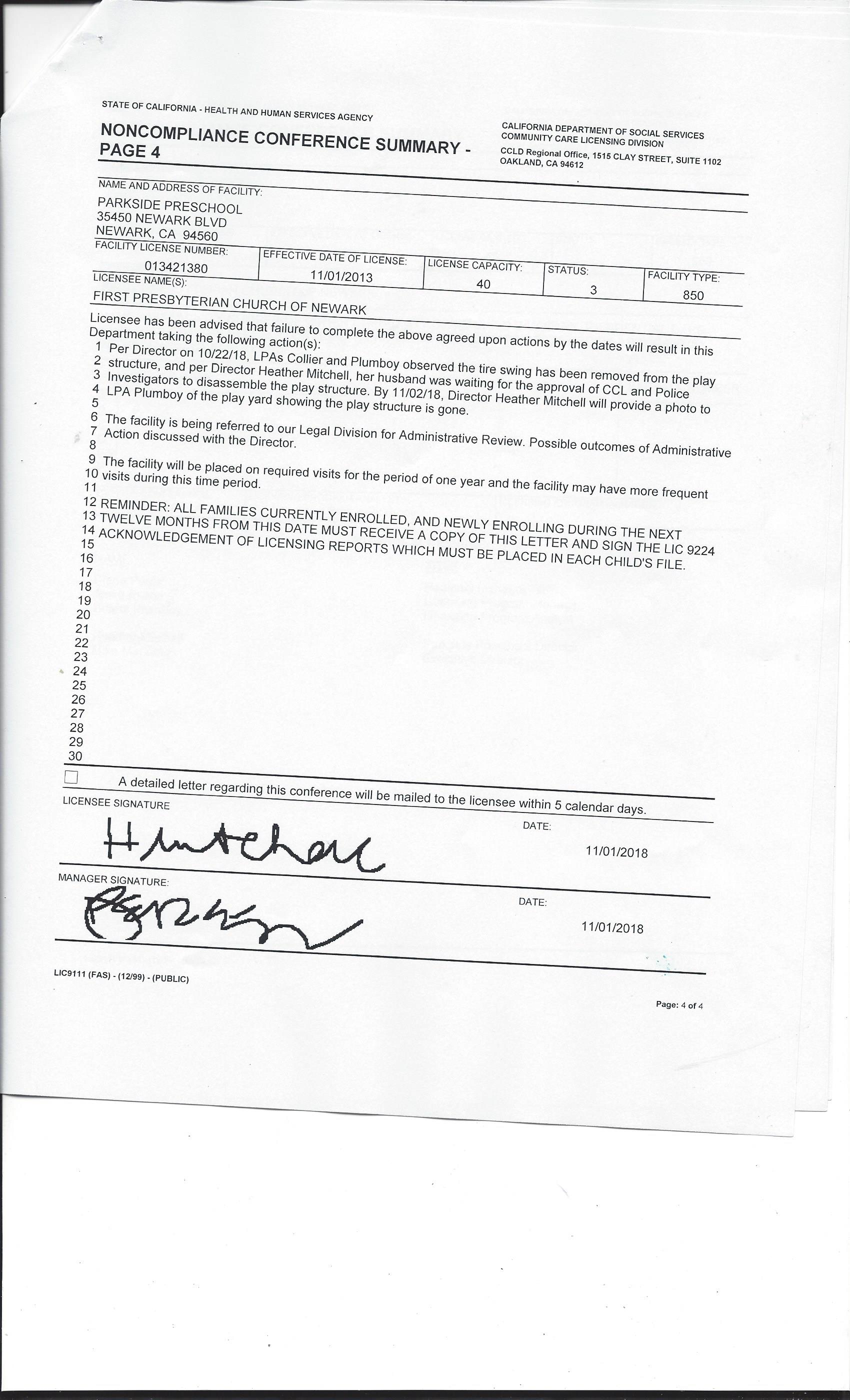 Park Side was required to provide the 11/1/2018 Noncompliance Conference Summary to parents. The PDF Park Side provided did not include all pages. When asked, Heather Mitchell sent me the missing fourth page.